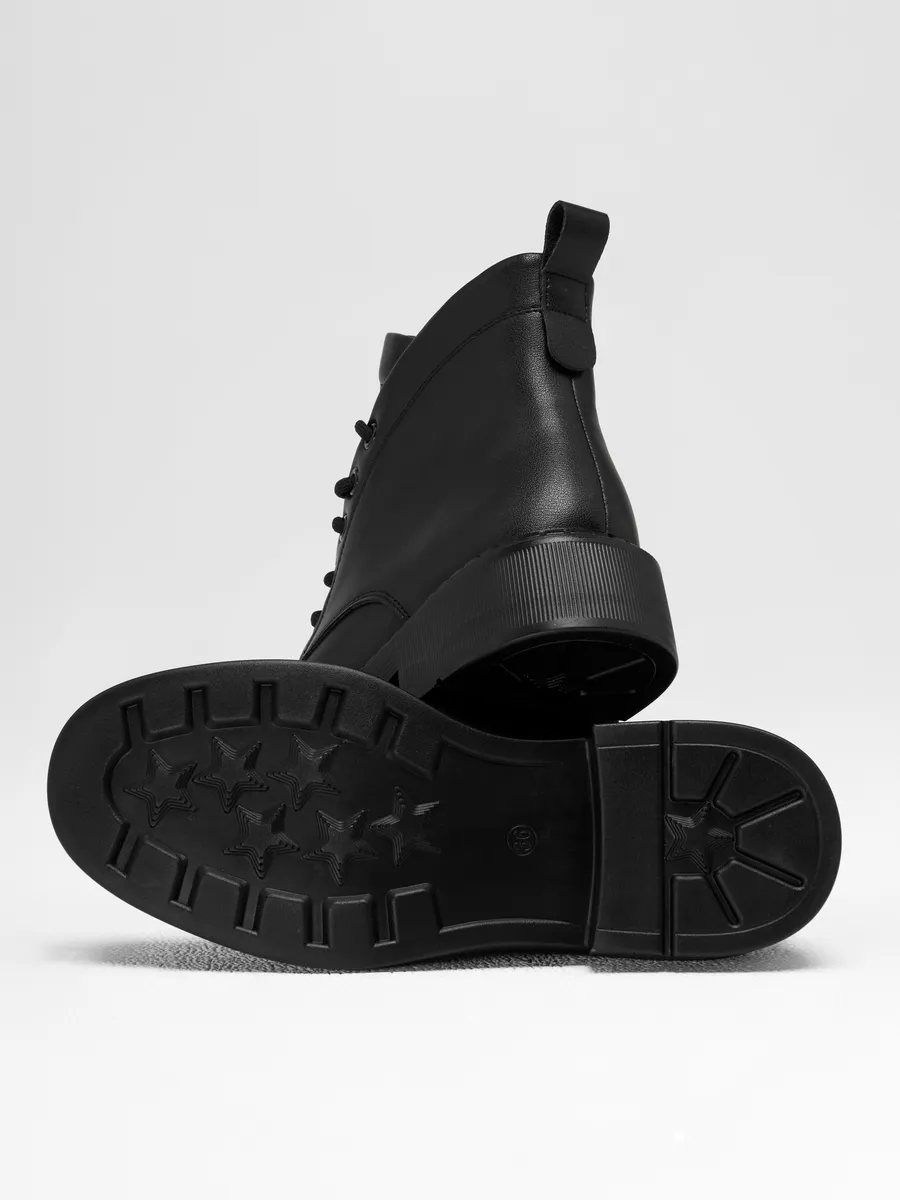 Короткие полуботинки выполнены из мягкой натуральной кожи, она обладает прочностью и хорошей воздухопроницаемостью. В совокупности эти материалы создают оптимальный микроклимат внутри обуви. Шнуровка помогает подстроить обувь под индивидуальные особенности стопы.