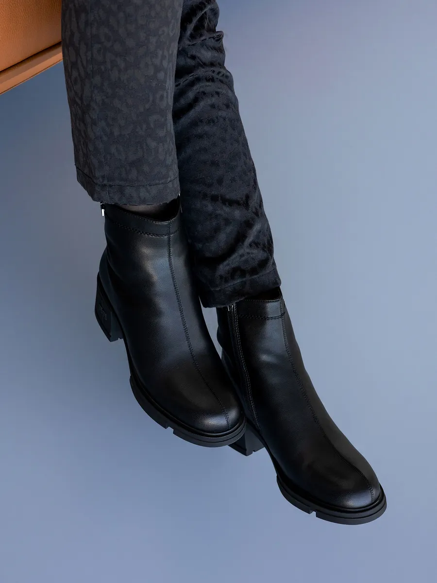 Наши короткие полусапожки черного цвета изготовлены из натуральной кожи, что гарантирует долговечность и элегантный внешний вид. Съемная стелька с ортопедическим эффектом и устойчивый каблук обеспечиват максимальный комфорт ходьбе, даже на скользкой поверхности.