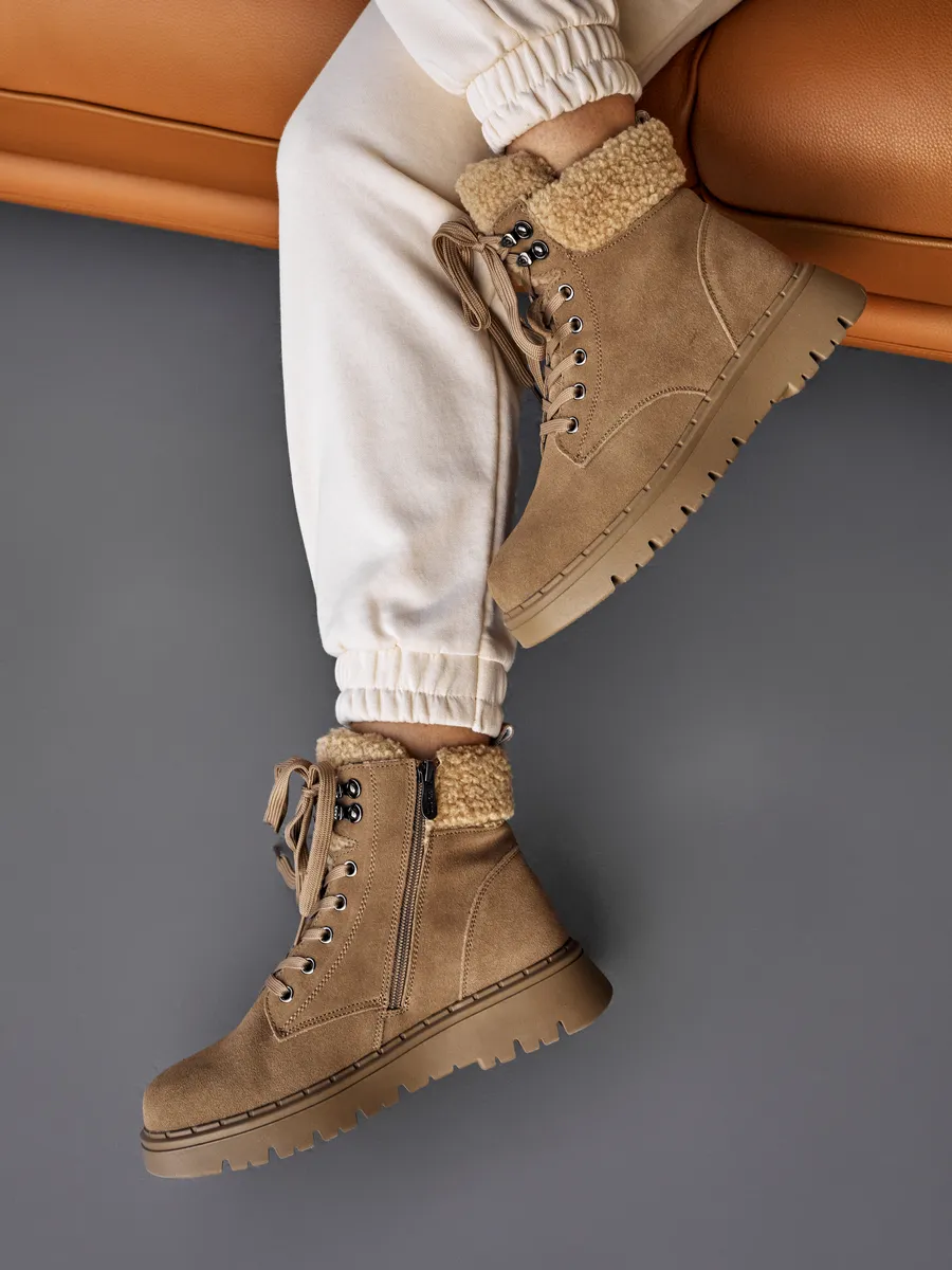 Эти бежевые зимние ботинки на платформе обеспечат отличную устойчивость на скользких поверхностях. Натуральная съемная шерстяная стелька обеспечит тепло и комфорт ваших ног в холодный сезон. Высококачественные материалы гарантируют долговечность, устойчивы к истиранию и идеально подходят для зимнего периода.