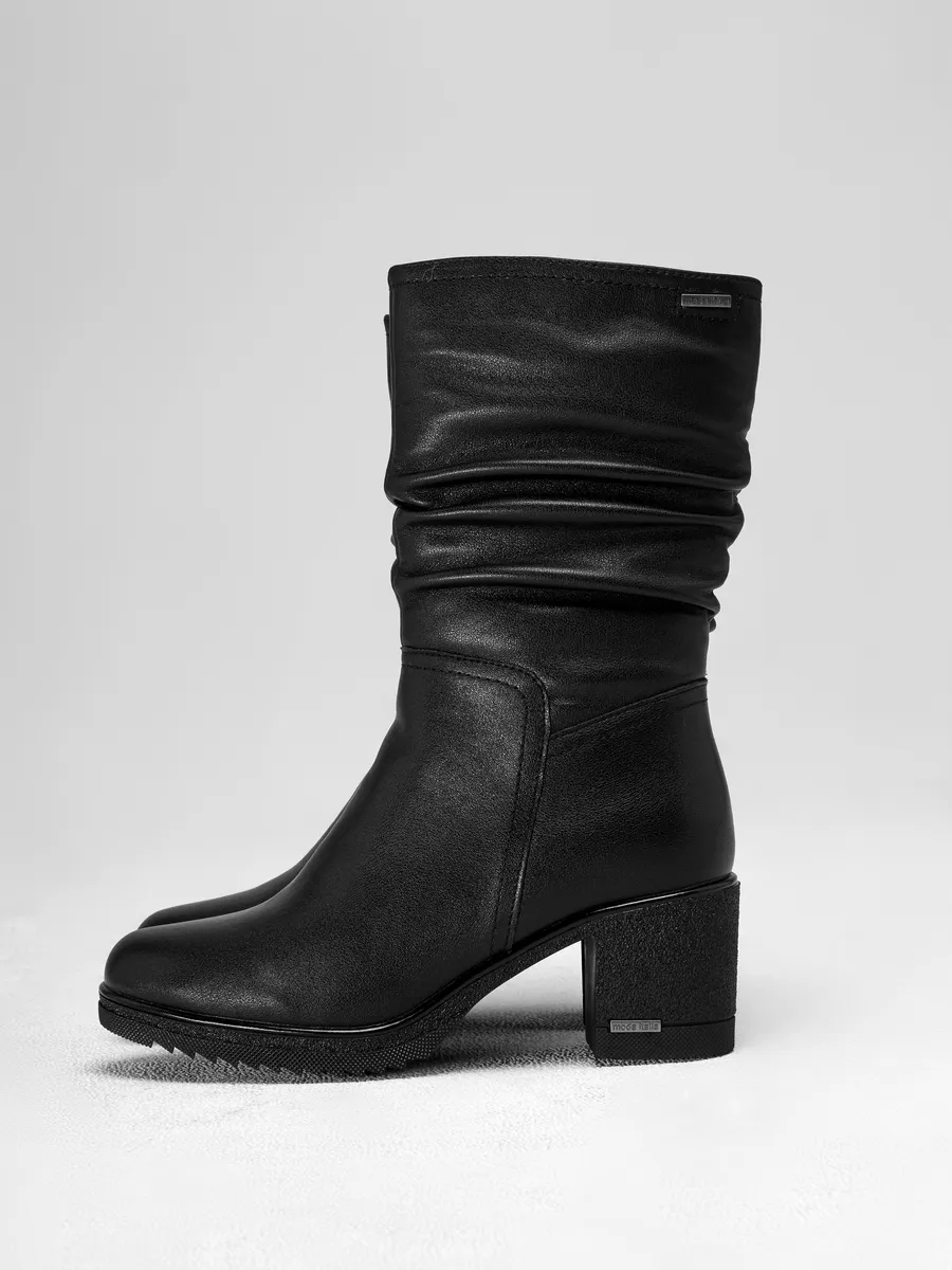 Удобный низкий каблук позволят ощущать себя более устойчиво на скользкой поверхности в зимний период. Классические короткие сапоги черного цвета подойдут к любому наряду, делая Ваш образ неповторимым. Эти сапоги - тренд 2025 года.
