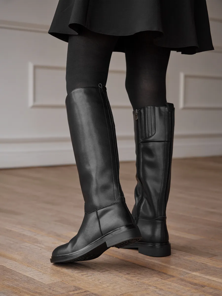 Сапоги имеют длинное голенище, которое дополнительно расширяется резинкой, что придаёт им изысканный вид. Они подойдут для проблемных стоп. Классический чёрный цвет делает их универсальными и подходящими для любого наряда — будь то повседневный или праздничный, под платье или штаны. Теплая съемная шерстяная стелька с ортопедическим эффектом и утеплённая подкладка обеспечивают комфорт и тепло даже в самые холодные дни. Подкладка из байки в верхней части, а в нижней из натуральной шерсти гарантирует тепло ваших ног теплой зимой.