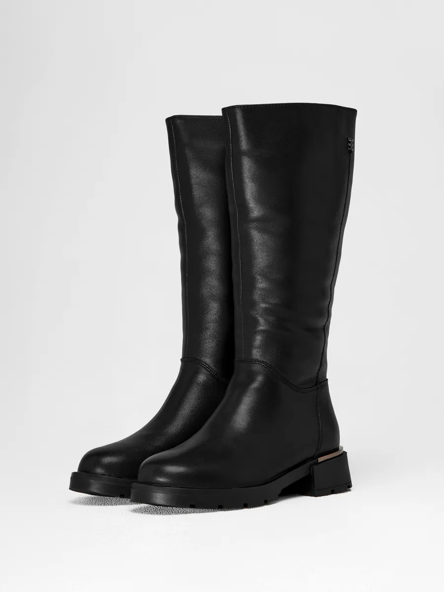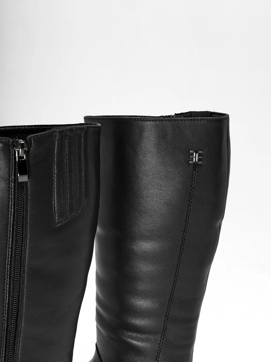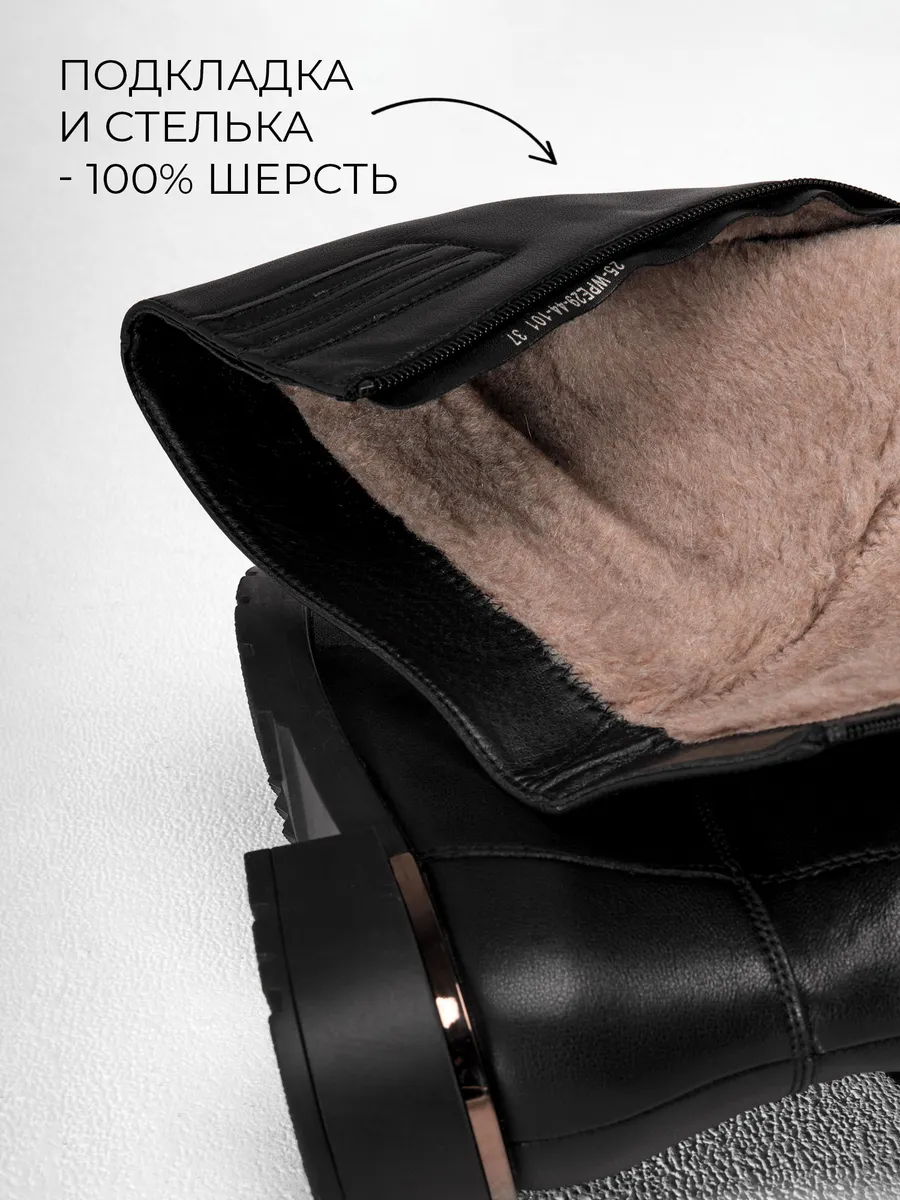 Сапоги имеют длинное голенище, что придаёт им изысканный вид. Они подойдут для проблемных стоп. Классический чёрный цвет делает их универсальными и подходящими для любого наряда — будь то повседневный или праздничный. Теплая съемная шерстяная стелька с ортопедическим эффектом и утеплённая подкладка обеспечивают комфорт и тепло даже в самые холодные дни.