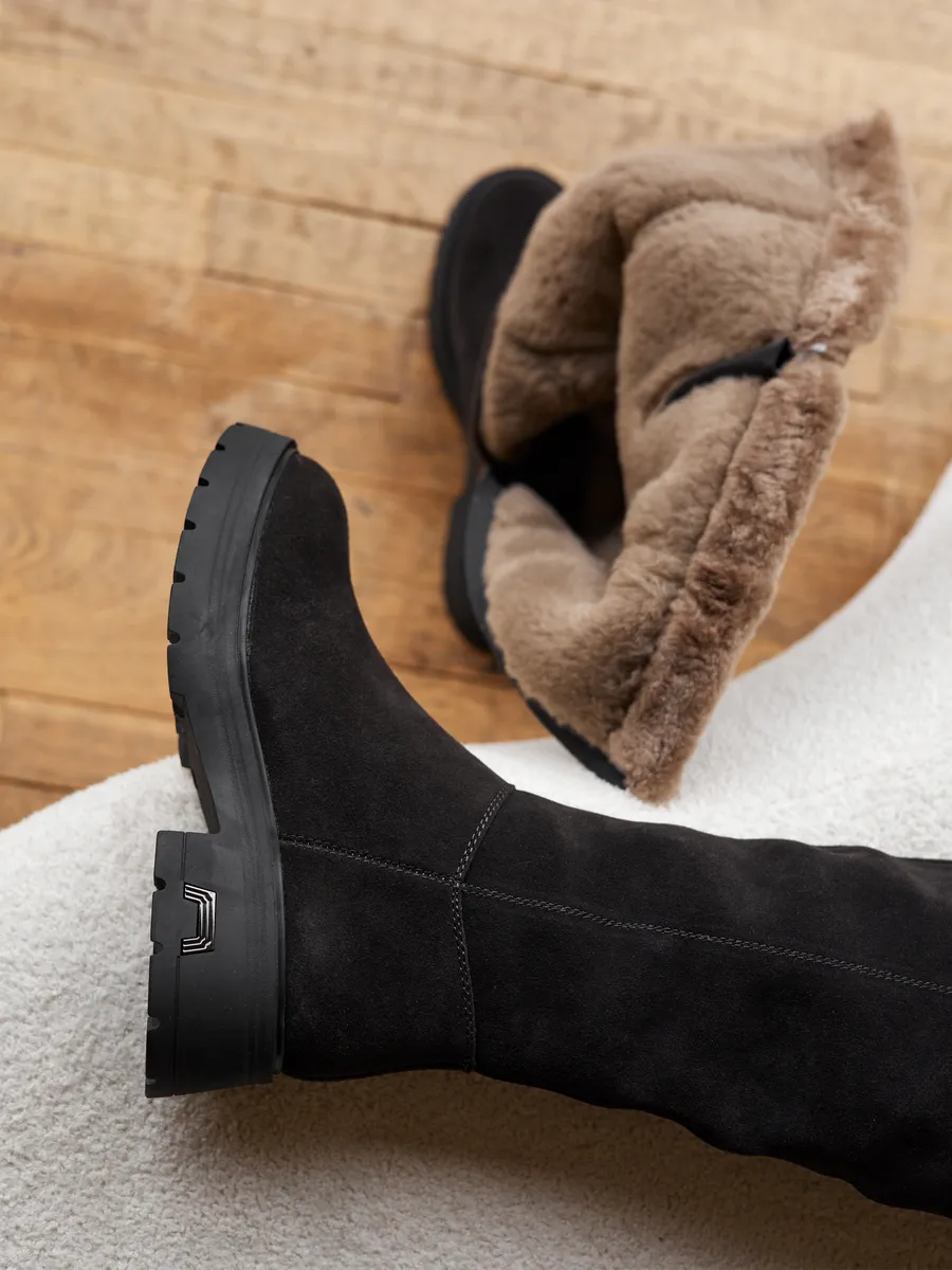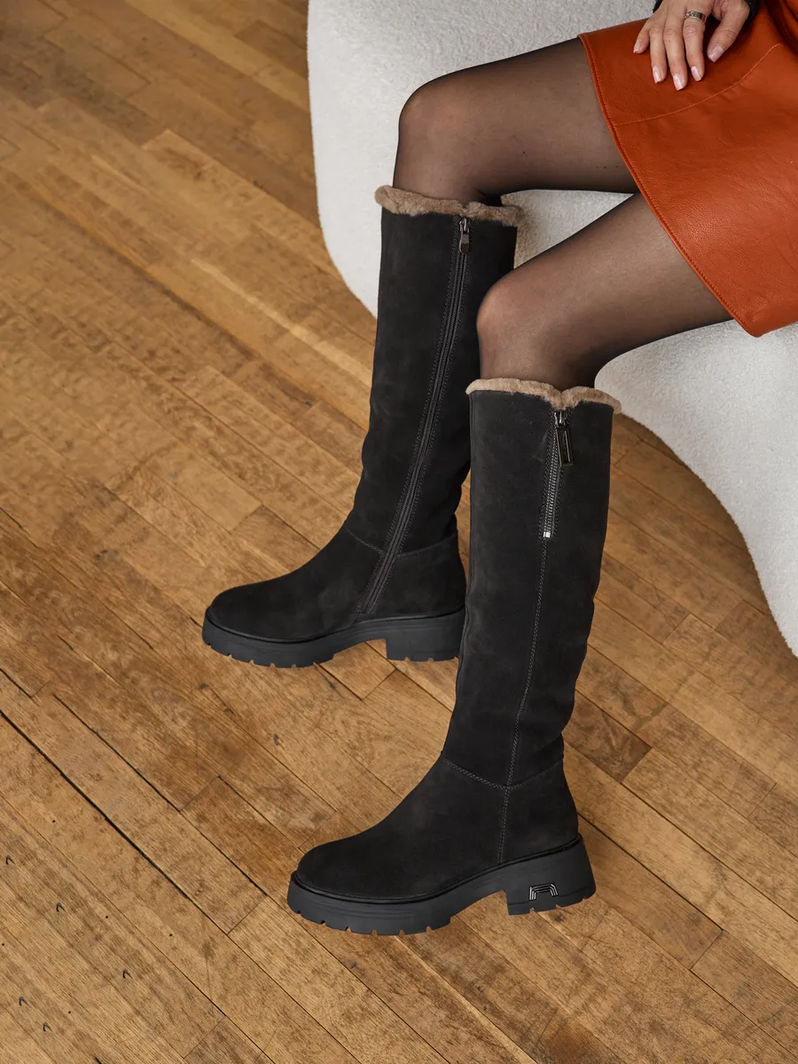 Сапоги выполненные из высококачественной натуральной замши обеспечивают долговечность и комфорт. Длинные сапоги с функциональной молнией на верхней части голенища позволяют увеличить обхват примерно на 4,5 см. Подкладка и съемная стелька из натуральной шерсти гарантирует тепло ваших ног в сильные морозы. Тракторная подошва позволит чувствовать себя устойчиво на скользкой поверхности.