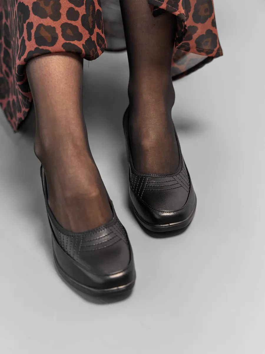 Туфли выполнены в классическом стиле с закрытым круглым носком, что делает их утончённым выбором для женщин, ценящих сдержанную элегантность. Устойчивый каблук средней высоты обеспечивает комфорт на протяжении всего дня. Эта обувь подойдёт как для работы в офисе, так для торжественных мероприятий, повседневных прогулок.