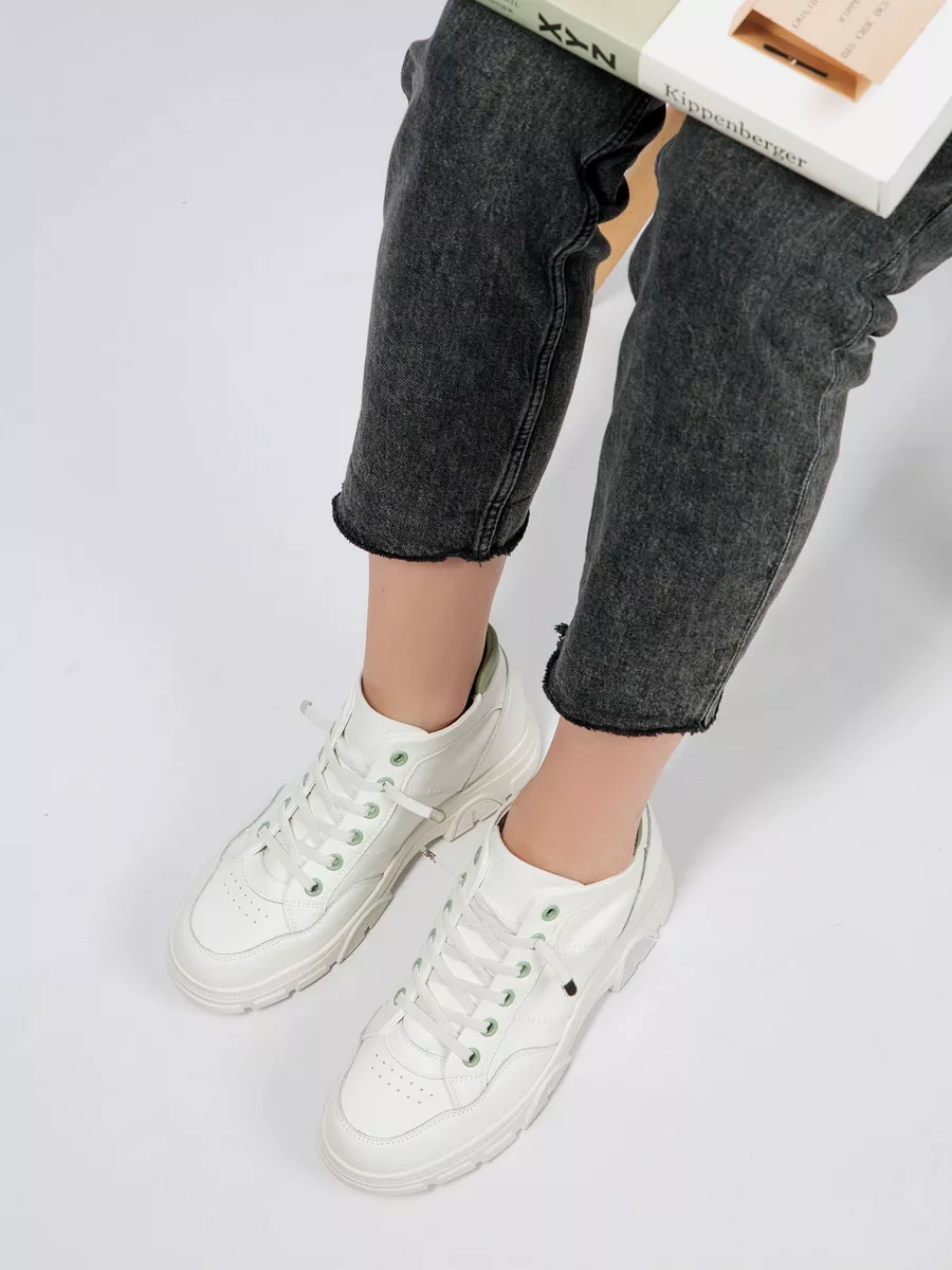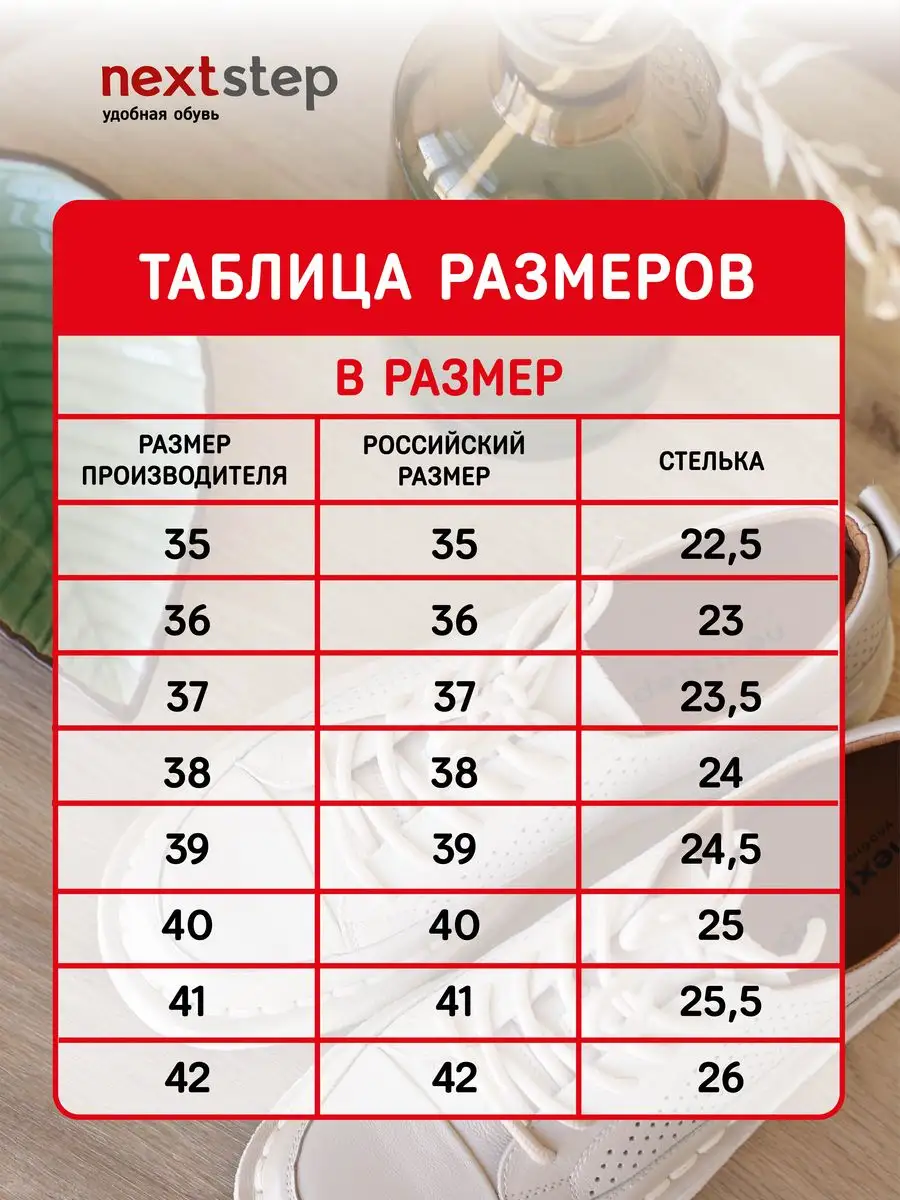 Модель идет в размер. Длина стельки в 38 размере равна 24см. Женские кожаные кроссовки Next Step (Некст Степ) отлично подходят не только для прогулок по городу, но и для занятий спортом, активного отдыха, а так же для сменной школьной обуви для девочки подростка. Кеды женские имеют удобную шнуровку и плотно облегают ногу. Выполнены из натуральной кожи с перфорацией, что обеспечивает дополнительную вентиляцию и создает уютный микроклимат ваших ног даже в жаркую погоду. Мягкая кожа отличается прочностью и износостойкостью, не поддается истиранию. Кожаные кроссовки женские - прекрасный вариант обуви для спортзала, а также пробежек на открытом воздухе. Классические белые женские кроссовки имеют стильный дизайн, поэтому отлично подойдут практически под любую одежду. Легкая подошва из полиуретана с нескользящей подметкой обладает высокой гибкостью и амортизацией. Универсальная женская модель весна-лето 2023. Светлые белые ботинки подойдут как на лето, так и на конец весны и начало осени. Кроссовки можно взять на сменку для работы, школы, фитнеса, медицинскому работнику. Белые кеды на белой толстой подошве подойдут как для подросткового возраста, но и для взрослой женщины. Полнота кед 7-8, говорит о том что они подойдут на среднюю, широкую, полную стопу и даже для стопы с косточкой. Легкие, повседневные, качественные, оригинальные светлые кеды на шнуровке станут дополнением любого модного образа и подарят комфорт на весь день.